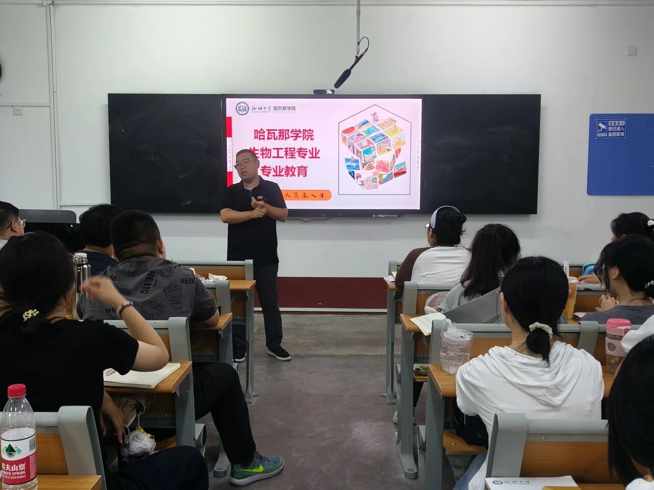 活动伊始,张扬系统介绍了生物工程专业的学科定位、发展历程与前沿趋势,详细阐述了专业在基因工程、发酵工程、生物制药等领域的核心方向及产业应用价值,让学生对生物工程专业有了全面的认知。随后,他阐述了专业课程体系、实践教学安排及升学就业路径,助力学生清晰了专业定位与学业规划。同时,张扬深刻剖析了生物工程技术对医疗健康、农业生产、环境保护等领域的革命性影响,着重强调了专业学习必须坚守“科学伦理、技术创新、产业落地”三大核心原则,帮助学生建立了对专业领域的宏观认知与责任意识。自由提问环节,学生积极提问,张扬结合行业实例逐一耐心解答,用专业视角化解新生困惑,现场氛围十分融洽。
