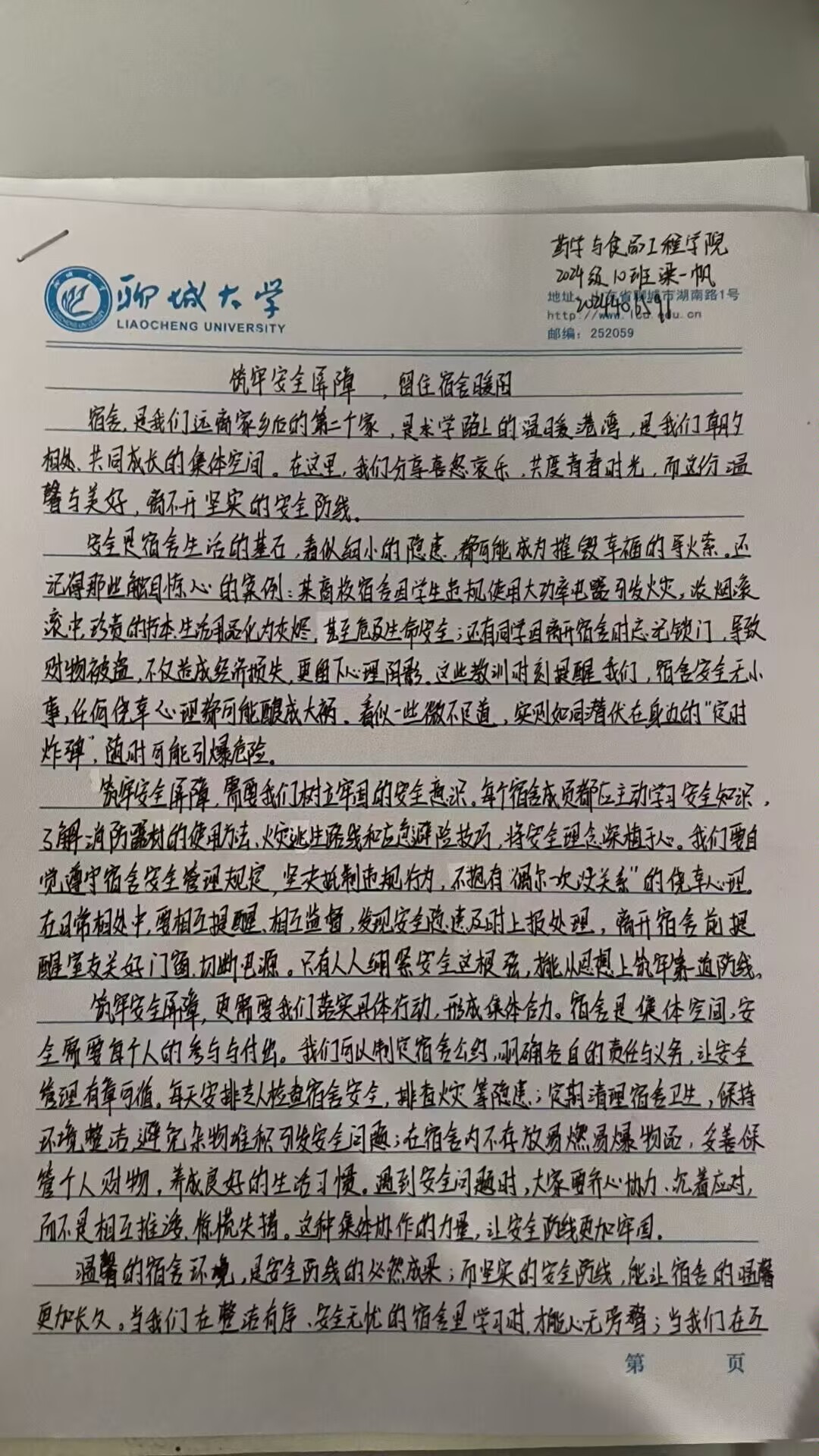 宿舍作为大学生在校期间学习生活的核心场所,是青春记忆的聚集地,更是师生共同守护的安全港湾。然而,宿舍内电器违规使用、消防通道堵塞、安全意识淡薄等问题仍潜藏着诸多火灾隐患,一旦发生意外,将直接威胁同学们的生命财产安全。为切实筑牢校园安全屏障,提升同学们的消防安全素养与应急自救能力,聊城大学药学与食品工程学院宿舍服务办公室精准把握宿舍安全管理痛点,特策划发起“共筑安全防线,守护温馨宿舍”主题消防安全征文活动,以文字为桥,让安全理念深入人心。