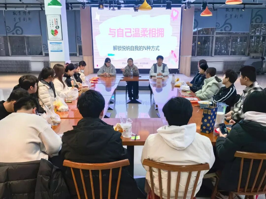 为筑牢学生心理健康教育防线,疏解学生学业生活中的心理压力与焦虑情绪,11月27日,我院于翰苑餐厅二楼举办以“心向暖阳,悦纳自我”为主题的餐厅沙龙活动,我院辅导员刘乐旋担任主讲人。